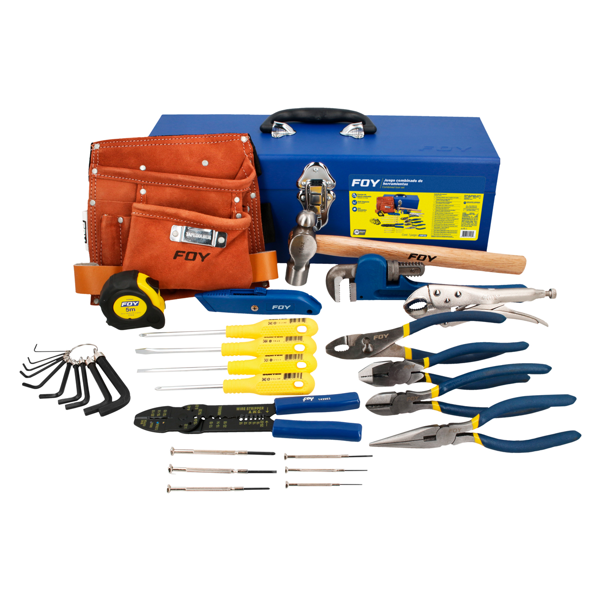 -Juego de herramientas que incluye. 1 portaherramientas de cuero de 2 bolsillos. 4 destornilladores mango amarillo. 1 flexómetro anti-impacto con cinta de 5m de longitud. -1 martillo de bola con mango de encino. 1 pinzas pela cable con mordazas. 1 pinzas para mecánico con doble mordaza. 1 llave stillson de hierro maleable. 3 pinzas para electricista diferentes usos. -6 destornilladores de precisión. 1 navaja de retráctil. 10 llaves hexagonales mm. 1 pinza de presión curva. La herramienta viene dentro de una caja metálica de 17x6" con asa plástica. -Juego básico de herramientas en empaque compacto. -Facilidad de transporte y almacenamiento. -Uso doméstico. Herramientas de gran relación precio-calidad. Diseñadas para trabajos ligeros y ocasionales enfocados en cubrir las necesidades básicas del hogar.