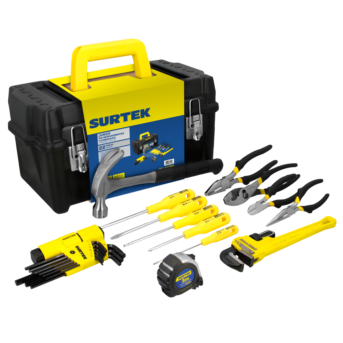 -Juego de herramientas para el hogar que incluye: 4 destornilladores amarillos 1000v. 1 martillo de uña curva. 1 llave stillson de hierro maleable. 9 llaves hexagonales "l". 1 flexómetro anti-impacto con cinta de 3m de longitud. 4 pinzas para electricista de diferentes aplicaciones. todo viene dentro de una caja plástica de 17x9" con broche metálico y costillas de refuerzo. -Juego de herramientas básicas. -Compacto. -Facilidad de transporte y almacenamiento. -De uso profesional ideal para trabajos en general.