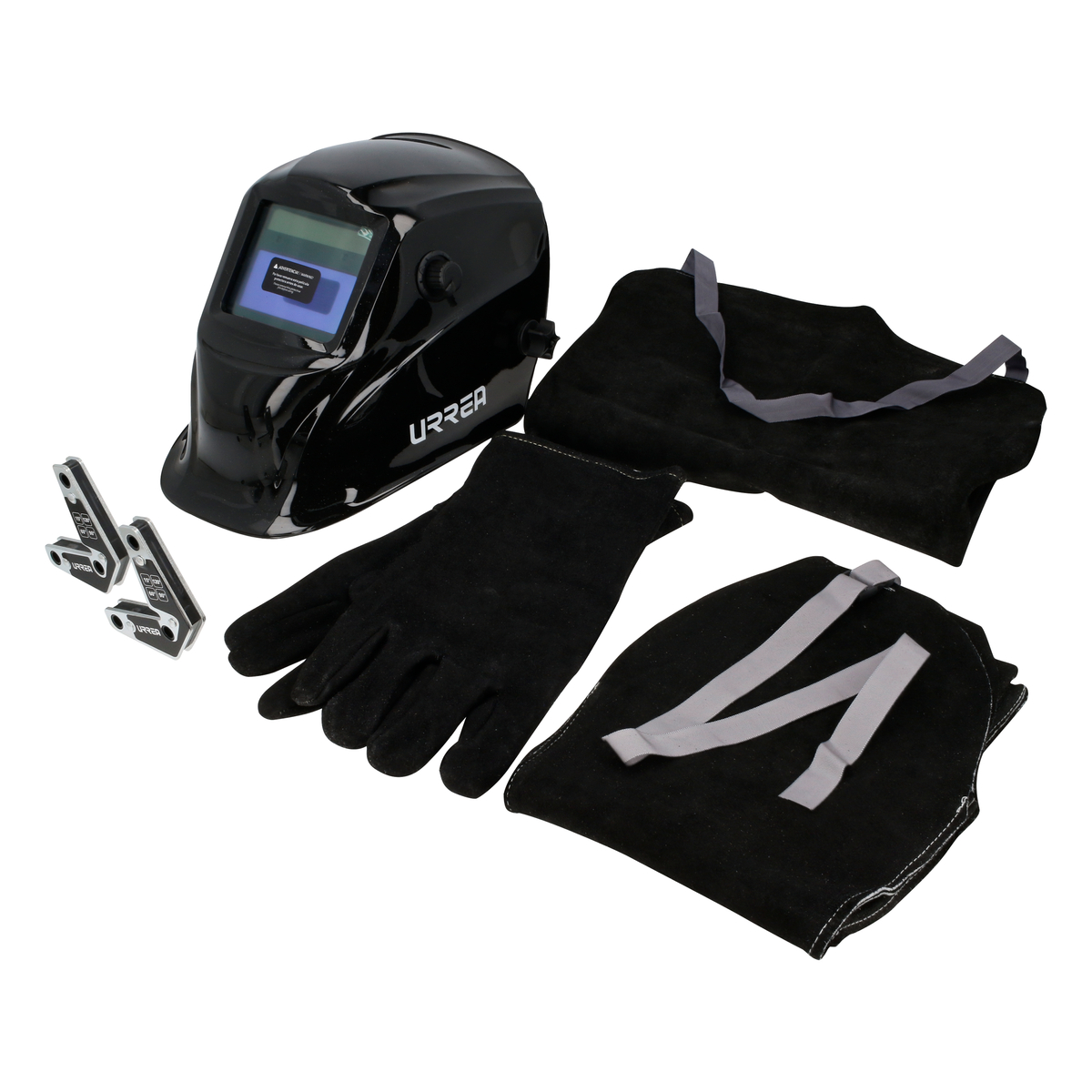 -Equipo de protección profesional para soldador. Uso pesado. 100% carnaza de vacuno. Costuras de Kevlar resistentes a la abrasión. Guantes con refuerzo en palma y pulgar. Careta con ajuste de inclinación de 5 posiciones, DIN (estado claro) 4. -Careta con batería de litio CR2032, recarga con luz solar. Campo de visión de 20 x 42 mm. -Protección para el trabajador en un solo lugar. -Rápida implementación. Mayor tiempo de vida útil del producto. -Juego ideal para realizar trabajos profesionales de soldadura y herrería.